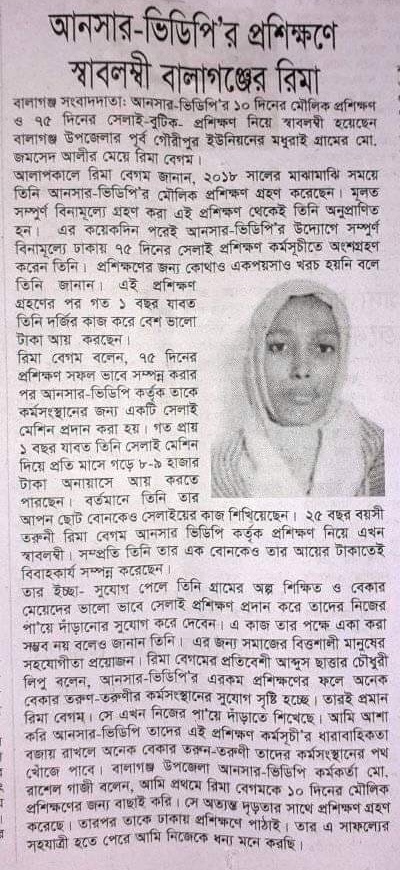 ভিডিপি মৌলিক প্রশিক্ষন ও সেলাই প্রশিক্ষন করে স্বাবলম্বী হয়েছেন সিলেটের বালাগঞ্জের রিমা বেগম ।